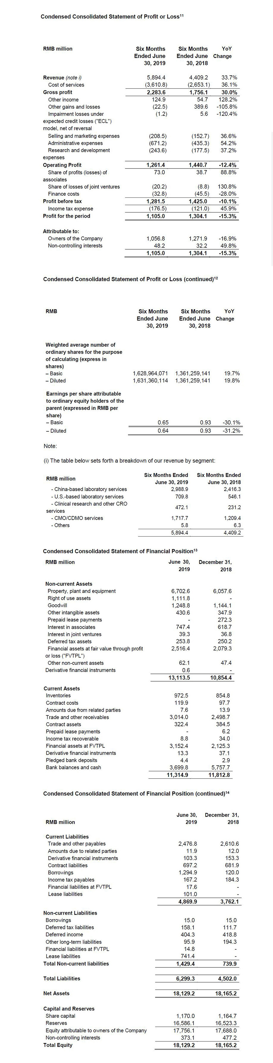 Mr. Edward Hu further commented, “Our China-based laboratory services segment expanded its global and domestic customer base, improved customer penetration, and maintained a steady revenue growth rate of 23.7% to RMB 2,989 million. Our small molecule CDMO/CMO services portfolio increased from 650+ molecules at the end of 2018 to over 800 molecules as of June 30, 2019, and revenue grew 42.0%. US-based laboratory services revenue growth increased 30.0%, compared to a drop of 1.9%, in the same period last year. This was primarily due to cell and gene therapies CDMO services progressing more projects to later stage. Likewise, our medical device testing business returned to more historical levels of growth. Clinical research services was our fastest growing segment. Revenue grew 104.2%, driven by strong development of the domestic new drug clinical trial market, and contribution from acquired clinical CRO business.”