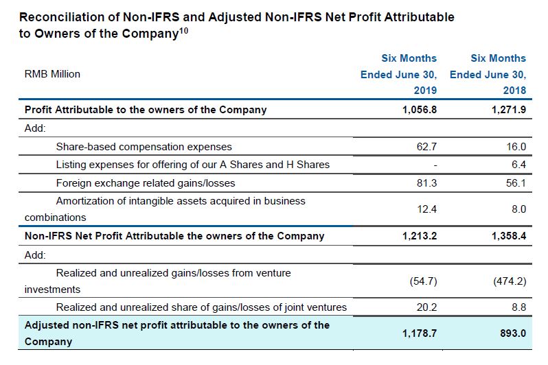 We provide non-IFRS net profit attributable to owners of the Company and earnings per share, which exclude share-based compensation expenses, listing expenses for offering of our A shares and H shares, foreign exchange-related gains or losses and amortization of intangible assets acquired in business combinations. We further provide an adjusted non-IFRS net profit attributable to owners of the Company and earnings per share, which exclude realized and unrealized gains or losses from our venture investments and joint ventures. Neither is required by, or presented in accordance with IFRS. We believe that the adjusted financial measures used in this press release are useful for understanding and assessing our core business performance and operating trends, and we believe that management and investors may benefit from referring to these adjusted financial measures in assessing our financial performance by eliminating the impact of certain unusual and non-recurring items that we do not consider indicative of the performance of our core business. However, the presentation of these adjusted non-IFRS financial measures is not intended to be considered in isolation or as a substitute for the financial information prepared and presented in accordance with IFRS. You should not view adjusted results on a stand-alone basis or as a substitute for results under IFRS, or as being comparable to results reported or forecasted by other companies.