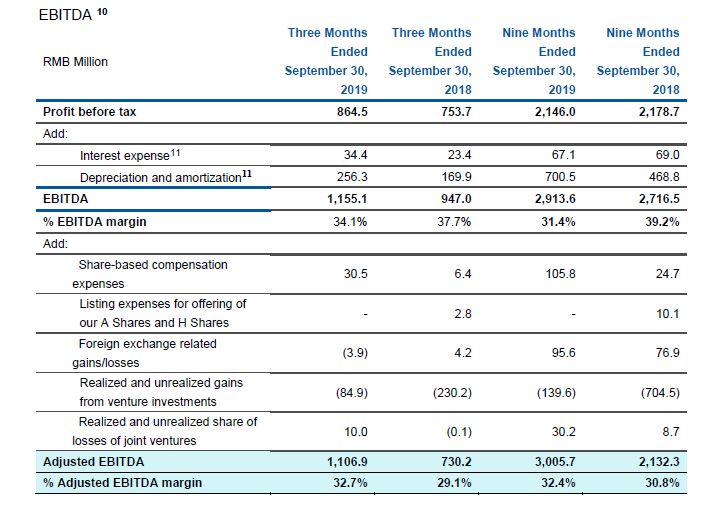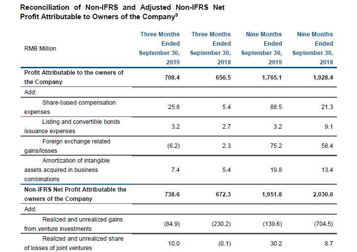- Third-Quarter 2019 non-IFRS net profit attributable to owners of the Company increased 9.9% year-over-year to RMB 739 million. This adjusts for share-based compensation expenses, listing expenses and convertible bonds issuance expenses, distribution expenses for convertible bonds, foreign exchange-related effects and amortization of intangible assets acquired in business combinations.