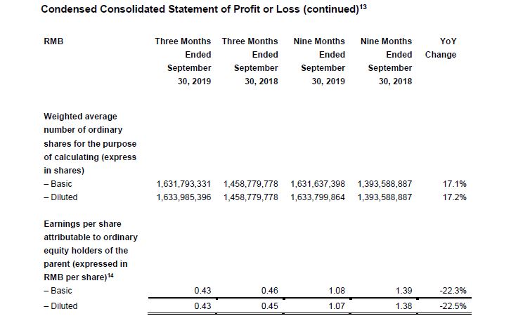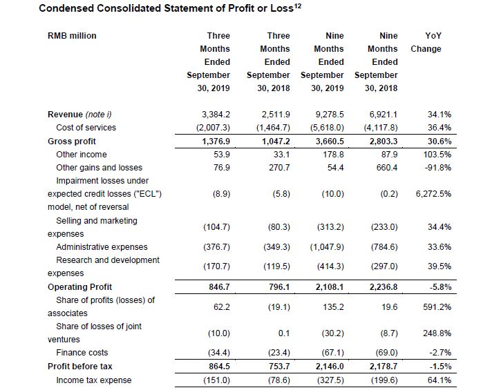 - Year-to-Date 2019 non-IFRS net profit attributable to owners of the Company decreased 3.9% year-over-year to RMB 1,952 million. This adjusts for share-based compensation expenses, listing expenses and convertible bonds issuance expenses, distribution expenses for convertible bonds, foreign exchange-related effects and amortization of intangible assets acquired in business combinations.