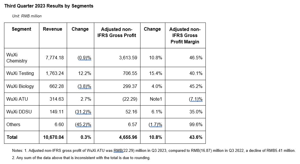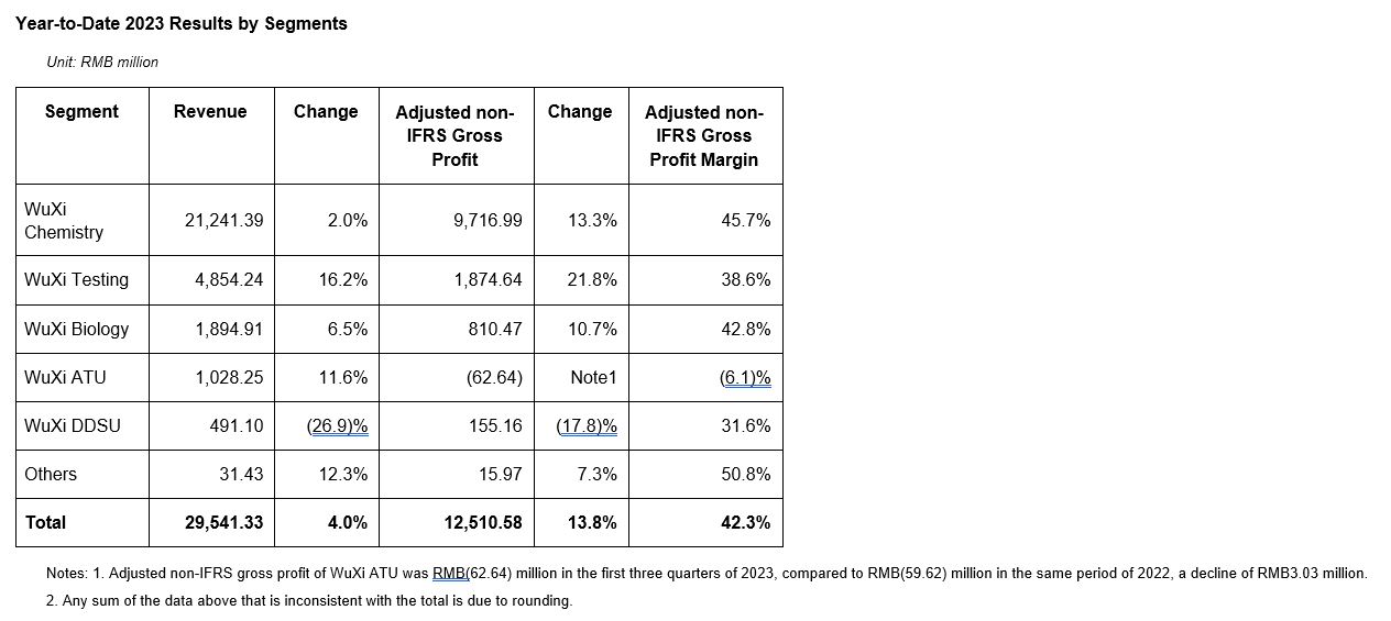 l Q1-Q3 revenue from WuXi Biology grew 6.5% year-over-year to RMB1.89 billion. Q1-Q3 adjusted non-IFRS gross profit margin was 42.8%, with 1.6pts year-over-year improvement due to FX impact.