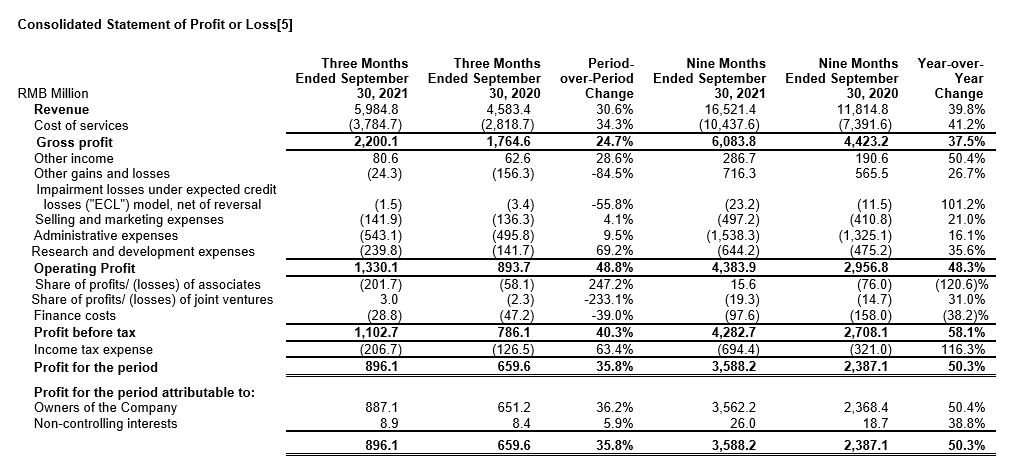 -Net profit attributable to owners of the Company increased 50.4% year-over-year to RMB3,562 million. The strong net profit growth is mainly attributable to robust revenue growth and continuous improvements to the Company’s operating efficiencies.