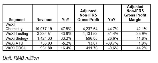 ·WuXi Chemistry revenue grew 47.5% to RMB10,077 million, adjusted non-IFRS gross profit grew 44.7% to RMB4,238 million, gross profit margin at 42.1%.