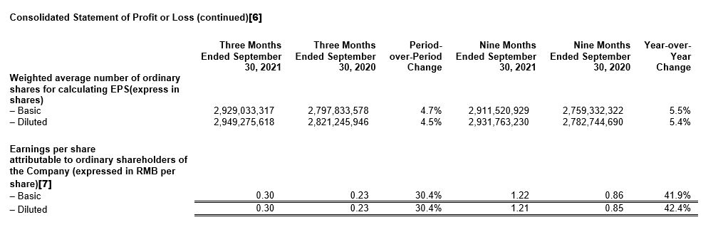 [7] In 2021, pursuant to the 2020 Profit Distribution Plan considered and approved by the shareholders' general meeting, the Company issued 2 shares for every 10 shares of the Company by way of capitalization of reserve. In accordance with the regulations of the China Securities Regulatory Commission, the Company has adjusted the basic earnings per share and diluted earnings per share for the comparative period according to the 2020 Profit Distribution Plan.