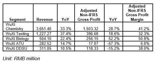 ·WuXi Chemistry revenue grew 33.3% to RMB3,651 million, adjusted non-IFRS gross profit grew 28.7% to RMB1,503 million, gross profit margin at 41.2%.