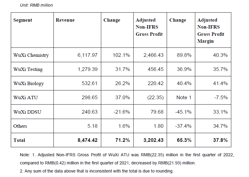 · WuXi Chemistry revenue grew 102.1% to RMB 6,118 million and adjusted non-IFRS gross profit grew 89.8% to RMB 2,466 million, with a gross profit margin of 40.3%.