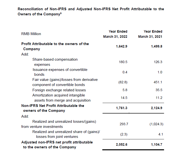 We provide non-IFRS gross profit, exclude the impact in revenue and cost from effective hedge accounting, share-based compensation expenses and amortization of intangible assets acquired in business combinations, and non-IFRS net profit attributable to owners of the Company, which exclude share-based compensation expenses, issuance expenses of convertible bonds, fair value gain or loss from derivative component of convertible bonds, foreign exchange-related gains or losses, amortization of intangible assets acquired in business combinations and goodwill impairment. We also provide adjusted non-IFRS net profit attributable to owners of the Company and earnings per share, which further exclude realized and unrealized gains or losses from our venture investments and joint ventures. Neither is required by, or presented in accordance with IFRS.