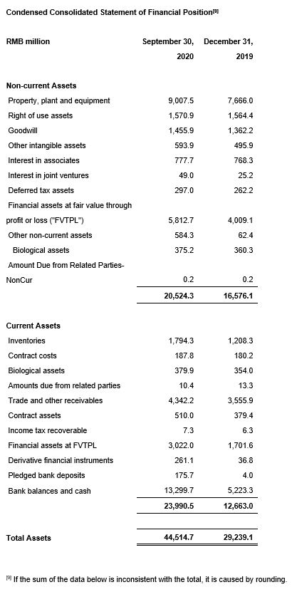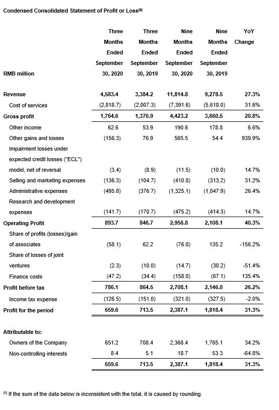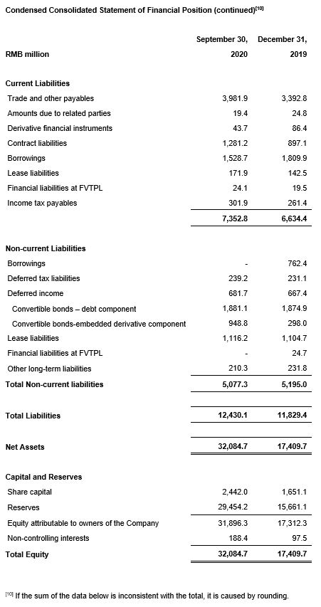 · Reported net profit attributable to owners of the Company declined 8.1% year-over-year to RMB651 million, mainly because: (1) In the third quarter of 2020, CNY appreciated sharply against the USD. We reported a RMB154 million net loss, due to realized and unrealized exchange loss of the proceeds of new H-Share placement and other USD assets held by the Company, partially offset by the gains from our foreign currency forward contracts. In the same period last year, we reported a RMB 4 million net gain. (2) Non-cash loss of RMB190 million from the derivative component of our convertible bonds due to the increase of our H share price.
